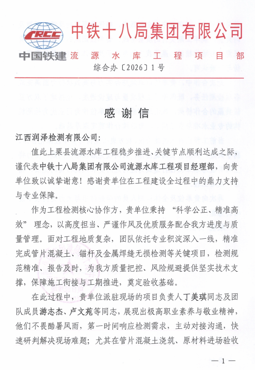 近日,江西润泽检测有限公司(以下简称“润泽公司”)收到中铁十八局集团有限公司发来的感谢信。