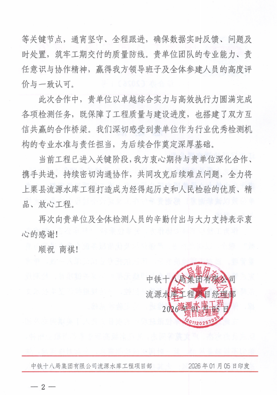 信中高度赞扬了润泽公司检测项目组在上栗县流源水库工程质量检测过程中“科学公正、精准高效”的精神,对项目负责人丁美琪及团队成员游志杰、卢文苑表示感谢。信中提到,项目组成员具有极高的专业素养与敬业精神,第一时间响应检测需求,主动对接,不畏严寒酷暑,通宵坚守全程跟进,快速研判解决现场难题,为混凝土管片生产等构筑牢固质量防线,为工程质量保驾护航。